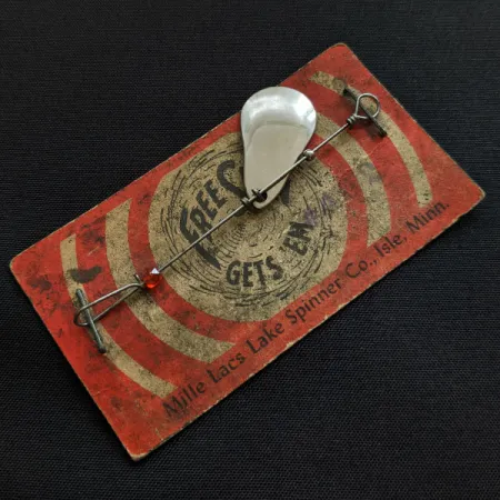 Ett förnicklat droppformat skedblad präglar den visuella profilen på denna Mille Lacs Lake Spinner. Betet sitter monterat på sitt ursprungliga röd- och guldfärgade originalkort och är oanvänt, i samma skick som när det lämnade Mille Lacs Lake Spinner Co.-fabriken i Isle, Minnesota. En fasetterad röd pärla sitter trädd på trådkroppen som mäter 6 cm (2 1/4 tum) i längd. Detta exemplar med produktkod 20622 har en låg vikt på 1 g (1/32 oz). Konstruktionen består av en enkel bygel för skeden och handtvinnade öglor i båda ändar, vilket är ett klassiskt utförande för USA-tillverkade insjöbeten.