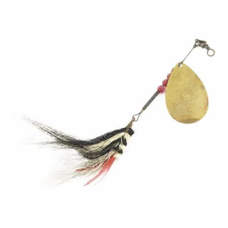 Polerad mässing ger det droppformade skeden på denna Miller #3 MFG Springwater-spinnare dess klassiska lyster. Betet är 10 cm (4") långt och väger 7 g (1/4 oz) för effektiva kast. Tre genomskinliga röda facetterade pärlor ger visuell kontrast mot trådachseln och mässingskomponenterna. Detta bete, med produktkod 24496, visar hantverket från Miller Fishing Lure Co. sedan 1929. Kroken är kraftigt bunden med en kombination av svart och vitt hår, avslutad med en klarröd fjäder vid stjärten. Det allmänna skicket är mycket gott (4/5). En distansbricka i metall skiljer pärlorna från öglan, vilket säkerställer att skeden kan rotera fritt på axeln.