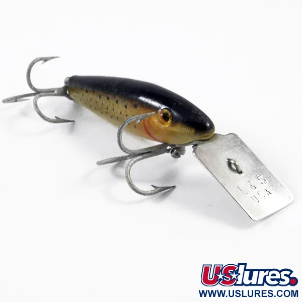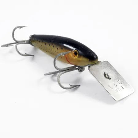 Detta lilla sjunkande bete, stämplat med "L&S USA" på sin karakteristiska fyrkantiga metallsked, representerar en klassisk era av amerikansk redskapsdesign från L&S Bait Company. MirrOlure är 4 cm (1 1/2") långt och väger 2,5 g (3/32 oz) och har en öringfinish med en mörk kolgrå rygg som övergår i guldgula sidor. Fina svarta prickar täcker sidorna, kompletterat med en röd böjd linje bakom ögat för att simulera en gäle. Detta exemplar är i 5/5 skick, med färg och hårdvara välbevarade. Konstruktionen använder en infästning med två skruvar för dykskeden, vilket ger den ballast som krävs för ett sjunkande bete avsett för gädda eller gös. Hårdvaran består av två trekrokar med matt finish, vilket speglar den funktionella designen som var vanlig i mitten av 1900-talets amerikanska tillverkning.