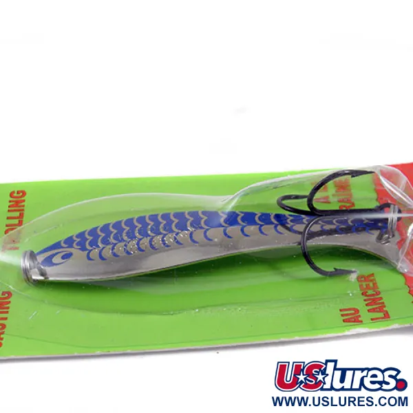 En polerad nickelfinish utgör basen för det djupblå fjällmönstret på detta kanadensiska bete, listat under produktkod 0725. Mooselook wobbler tillverkas av Williams och förblir ett klassiskt val för fiske efter kanadaröding och insjölax vid både spinnfiske och trolling. Den 9,5 cm (3 3/4") långa kroppen är i nyskick och levereras i sin karakteristiska röd-gröna originalförpackning från J.A. Greene Inc. Med en vikt på 10 g (1/3 oz) speglar skeddragets hantverk de höga metallurgiska standarder som är typiska för anrik nordamerikansk sportfiskeutrustning. Komponenterna inkluderar en robust trekrok fäst med en fjäderring i aktern, och varumärkets signatur är tydligt präglad på metallens baksida.