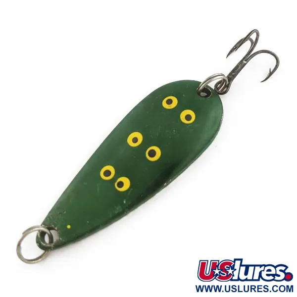 Detta skeddrag på 5 cm (2") är försett med ett mörkgrönt "Frog"-mönster och pryds av sex tydliga gula prickar med mörka centra, symmetriskt fördelade över metallkroppen. Draget är tillverkat i Japan av Moriyama och har en klassisk droppformad profil som är viktad för både spinnfiske och trolling. Metallbetet väger 12 g (2/5 oz) och är utrustat med en trekrok av vintagemodell monterad i en kraftig fjäderring i bakre delen. En ytterligare fjäderring sitter i nosen för enkel montering på linan. Produkten har artikelnummer 24123, och finishen på detta exemplar uppvisar tydliga tecken på användning motsvarande skicket 3/5.