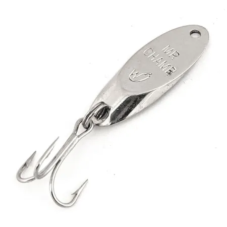 Den polerade förnicklingen fångar ljuset längs den slanka, aerodynamiska profilen på detta klassiska amerikanska skeddrag. Med en vikt på 1/4oz (7g) och ett mått på 1 1/2" (4cm), bär detta exemplar den distinkta "MR CHAMP"-stämpeln tillsammans med den karaktäristiska fågellogotypen. Dessa märkningar representerar en betydande era för företaget Weber, en tillverkare med hundraårig historia i USA och Kanada innan modellen förvärvades av Luhr Jensen. Konstruktionen i kraftig metall är parad med en vass trekrok ansluten via en robust fjäderring, vilket gör det till ett pålitligt val för distanskastning eller vertikalfiske. Identifierat med produktkod 12747, är draget i 5/5-skick och bibehåller en briljant reflekterande yta över hela kroppen.