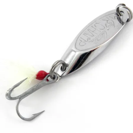 Inpräglat i den polerade krompläteringen identifierar texten "MR CHAMP" och "Tony Accetta" detta 8g (1/4oz) skeddrag som en klassisk del av amerikansk sportfiskeutrustning. Med en längd på 4 cm (1 1/2") representerar produktkod 3846 den fjäderklädda varianten av denna design, utrustad med vit fjäderdress på den bakre trekroken. Ett litet, lysande rött huvud avslutar fjäderbindningen och skapar en kontrast mot kroppens silverglans. Detta exemplar är i utmärkt skick (betyg 5/5) och verkar oanvänt, utan tecken på slitage på de kraftiga fjäderringarna eller den högblanka ytan. Den solida metallkroppen är avsmalnande för bättre kastegenskaper, och på baksidan syns en identifieringsetikett tydligt. Fjäderstjärten är säkert bunden och den ursprungliga trekroken är vass och i felfritt skick.