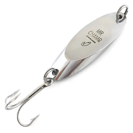 Tydligt präglat i den polerade ytan identifierar ”MR CHAMP”-märkningen detta klassiska amerikansktillverkade skeddrag från Weber. Med en vikt på 3/4 oz (21 g) har den tunga metallkroppen en briljant nickelfinish som reflekterar ljuset längs dess aerodynamiska form. Detta exemplar mäter 2 1/4" (6 cm) i längd, bär produktkod 5235 och representerar en tid innan serien förvärvades av Luhr Jensen. Framsidan pryds av den ikoniska logotypen med en hoppande fisk och texten ”MR CHAMP”, medan baksidan har en slät, spegelblank yta. En robust fjäderring förbinder en vass trekrok till stjärten, redo för vertikalt fiske eller långdistanskast. Detta bete levereras i skick 5/5 och visar den högkvalitativa plätering som Weber var kända för under sin hundraåriga historia på den nordamerikanska marknaden. Den övre öglan är försedd med en kraftig ring för säker lininfästning.