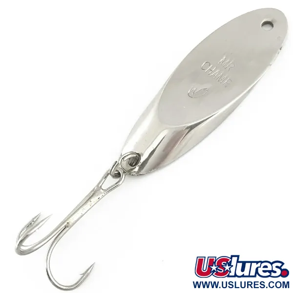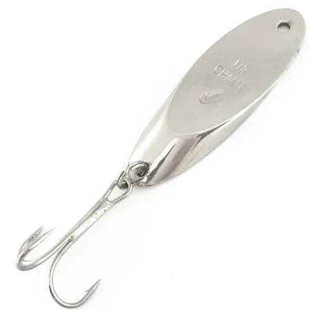 Förnicklingen ger en klassisk, reflekterande finish på detta 21g (3/4oz) tunga metallbete. Producerad av Weber, en amerikansk tillverkare med ett sekelgammalt arv inom sportfiskeindustrin, var Mr Champ-modellen en design som senare förvärvades av Luhr Jensen. Kroppen mäter 6cm (2 1/4") och har namnet "MR CHAMP" präglat direkt i metallen. Detta specifika exemplar, identifierat med produktkod 6932, är i toppskick med betyget 5/5. För riggning har den ett rent linhål vid det avsmalnande huvudet och en trekrok fäst med en fjäderring i stjärten.