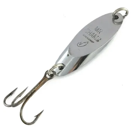 Tydligt präglat i den förnicklade ytan på detta 4,5 cm (1 3/4") skeddrag finns den ikoniska fisklogotypen tillsammans med Mr Champ-varumärket. Detta USA-tillverkade bete, katalogiserat under produktkod 9217, väger 10 g (1/3 oz), en storlek som traditionellt föredras för sin mångsidighet på olika sötvattensarter. Tillverkad av Weber, ett varumärke med ett sekelgammalt arv i USA före dess förvärv av Luhr Jensen, återspeglar metallarbetet den solida konstruktionen hos hårdvara från mitten av århundradet. Finishen förblir blank, kompletterad med robusta fjäderringar som säkrar både linfästet och den efterföljande kroken. Även om den ursprungliga trekroken visar viss naturlig mörkring från ålder på skaftet, förblir spetsarna vassa och metallkroppen är exceptionellt ren, vilket ger ett skickbetyg på 5/5. Den aerodynamiska, avsmalnande designen är konstruerad specifikt för långdistanskast eller vertikalt jiggfiske på djupare vatten.