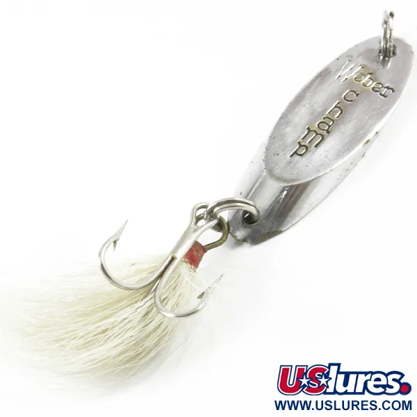 Weber MrChamp-varumärket är tydligt instämplat i den förnicklade ytan, vilket identifierar detta 4 cm (1 1/2") skeddrag som ett klassiskt exempel på fiskeutrustning från mitten av förra seklet. Tillverkat i USA under kod 3430, har detta drag en polerad nickelfinish som reflekterar ljuset längs den droppformade kroppen. Stjärtpartiet är utrustat med en fjäderklädd trekrok, sakkunnigt bunden med vit bucktail och säkrad med en distinkt röd trådlindning vid skaftet. Med en vikt på 8g (1/4oz) speglar draget de höga tillverkningsstandarder som Weber upprätthöll innan märket så småningom övergick till Luhr Jensen. Detta exemplar är i 4/5-skick, med en välbevarad yta och intakt hårdvara som behåller sin ursprungliga lyster. Fjäderringen i nosen och anslutningen till kroken är båda robusta, vilket understryker den enkla men effektiva designen som definierade MrChamp-serien.