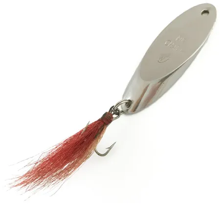 Med en vikt på 21 g (3/4 oz) representerar detta förnicklade skeddrag den tidiga amerikanska tillverkningsperioden för företaget Weber innan modellen senare förvärvades av Luhr Jensen. Den 6 cm (2 1/4") långa kroppen har en blank, reflekterande Nickel-finish som fortfarande är i 5/5-skick, vilket visar den höga nivå av omsorg som givits detta vintagebete. På metallen finns MrChamp-varumärket tydligt stämplat, tillsammans med produktkod 6130 som anger denna specifika konfiguration med hår. Enkelkroken är försedd med en handbunden röd hårtrailer, säkert fäst med en mörk lindning. Designat som ett mångsidigt kastbete, gör dess solida konstruktion och amerikanska arv det till en viktig del för varje samling av fiskeredskap från mitten av seklet.
