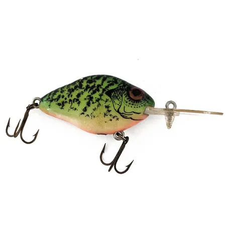 Med en längd på 5 cm (2") representerar detta exemplar utvecklingen av varumärket Lazy Ike under mitten av 1900-talet, från handtillverkat trä till hållbar plast. Finishen på denna crankbait med en vikt på 8 g (1/4 oz) uppvisar ett detaljerat mönster i crappie-stil, med en livlig grön bas täckt av kraftig svart fläckighet och en blek, gräddvit buk. Dess stora, mörka öga är ett karaktäristiskt designelement för Natural Ike-serien, utformat för att efterlikna de anatomiska dragen hos en riktig betesfisk. Ursprungligen tillverkad av Kautzky Manufacturing Company, ett företag grundat 1897 av österrikiska immigranter som senare blev en del av Pradco-familjen, bär denna modell produktkod 14779. Den genomskinliga hakskeden i plast är stämplad med modellnamnet, och även om den har en liten spricka, förblir betet en betydande del av den amerikanska sportfiskehistorien. Två trekrokar av standardmodell är fästa via öglor på buken och stjärten. Detta exemplar har skicket 4/5 och uppvisar en välbevarad färgsättning trots mindre slitage vid hakskeden.