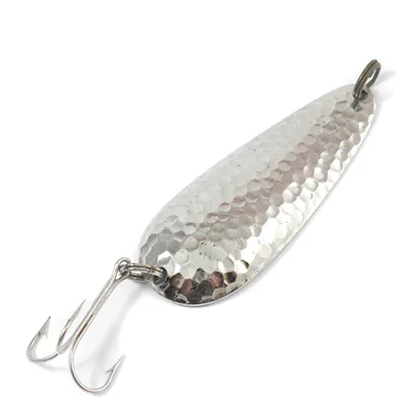 En distinkt hamrad finish på den konvexa ytan definierar den visuella karaktären hos detta klassiska skeddrag. Med måtten 3" (7,5 cm) och en vikt på 1/2oz (14 g) har detta exemplar i Hamrat nickel en mångfacetterad utsida designad för att fånga ljus från olika vinklar. På den släta insidan är metallen stämplad med tillverkarens märke som identifierar det som ett Nebco Flashbait 166, tillverkat i USA. Just detta exemplar, identifierat med produktkod 1975, är i utmärkt skick med betyget 5/5 och bibehåller en blank och ren yta på båda sidor. Utrustningen inkluderar originalfjäderringar och en stark trekrok som inte visar några tecken på ålder. Tunga skeddrag som detta Nebco var standardutrustning för sportfiskare som behövde extra vikt för att nå specifika djup eller för att kasta mot starka kustvindar.