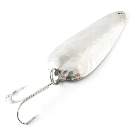 Hamrade nickelfjäll fångar och reflekterar ljuset längs den 7,5 cm (3") långa kroppen på detta klassiska skeddrag tillverkat i Minneapolis. Med en vikt på 14 g (1/2 oz) är Nebco FlashBait 166 ett rejält bete lämpligt för både spinnfiske och trolling. På den konkava sidan är stämpeln 'NEBCO FLASH BAIT 166 MPLS. MINN' fortfarande tydlig, vilket identifierar dess ursprung i Minnesotas sportfiskehistoria. Detta exemplar, med produktkod 4156, är i 4/5-skick med en ren yta som endast visar lätta tecken på hantering. Terminalutrustningen består av en fjäderring kopplad till en stor trekrok vid stjärten. Överst på den avsmalnande profilen finns ett precisionsborrat hål för säker anslutning till ett beteslås eller tafs.
