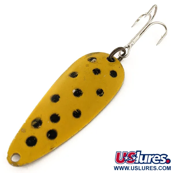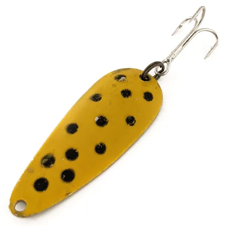 Gul färg med stora, handstämplade svarta prickar täcker den konvexa sidan av detta 5,5 cm långa skeddrag i metall. Nebco FlashBait 266 väger 10 g och har en baksida i polerad nickel där "FLASH BAIT NEBCO" och ursprungslandet USA är instämplat i metallen. Draget är monterat med en mörktonad fjäderring och en vass trekrok. Katalogiserad under kod 11765, håller detta vintageexemplar skicket 4/5, med visst lätt slitage från förvaring medan färg och stämpling fortfarande är tydliga.