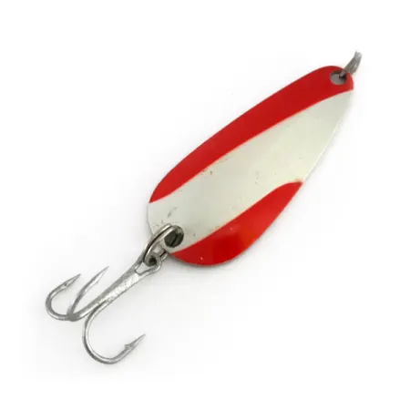 Diagonalt applicerade röd-vita emaljeränder pryder framsidan av detta klassiska skeddrag, en signaturlook för Nebco FlashBait 2662. Den 2" (5 cm) långa kroppen är stansad i massiv metall och har en högpolerad nickelfinish på baksidan, vilket ger en kraftig kontrast mot den målade sidan. Tillverkad i USA bär detta exemplar de tydliga stämplarna "FLASHBAIT" och tillverkarnamnet på baksidan av bladet. Med en vikt på 1/4 oz (8 g) är det ett mångsidigt drag för lättare fiske efter arter som abborre och öring. Denna specifika enhet, med produktkod 7932, är oanvänd och i utmärkt skick med ursprunglig lyster på de röda, vita och förnicklade ytorna. En kraftig silverfärgad trekrok är fäst med en robust fjäderring i skedens nederkant.