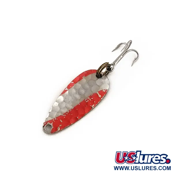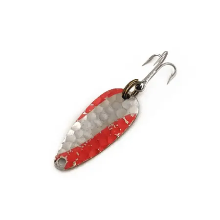 Hamrade nickelstrukturer över skedens framsida definierar denna Nebco FlashBait 466, ett litet stycke amerikansk sportfiskehistoria som väger endast 1/32 oz (1 g). Med en längd på bara 3/4" (2,2 cm) har betet ett tydligt färgmönster med djärva röda diagonala ränder över den präglade ytan. Denna specifika modell, identifierad med produktkod 11762, uppvisar den klassiska Nebco-designen avsedd för exakt ultralätt kastfiske. Den släta baksidan i metall är tydligt stämplad med varumärket och "MADE IN USA", vilket speglar tidens tillverkningsarv. Monteringen består av en mörktonad fjäderring parad med en vass trekrok. Bedömd till skick 5/5, visar exemplaret välbevarad färg och tydlig stämpling, vilket gör det till ett fint exempel på hantverk av mikroskeddrag från mitten av seklet.