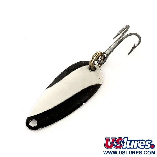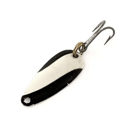Tydligt stämplad på den förnicklade baksidan identifierar märkningen 'NEBCO FLASHBAIT 466' detta lilla amerikansktillverkade skeddrag. Med en längd på endast 2,2 cm (0 3/4") och en vikt på bara 1 g (1/32 oz) är detta exemplar ett klassiskt exempel på tidig ingenjörskonst för ultralätt fiske från USA. Framsidan har en djärv, diagonal vit rand målad över en svart bas, vilket skapar ett visuellt mönster med hög kontrast. Dess droppformade profil övergår i en polerad baksida av nickel, vilket ger en ljus reflekterande yta. En liten fjäderring förbinder den ursprungliga trekroken med stjärten, medan den främre öglan för lininfästning är ren och öppen. Katalogiserat under produktkod 12114 representerar detta bete från Nebco en specifik era då beten med liten profil blev nödvändiga för fiske efter abborrfiskar och öring. I 5/5 skick är färgen och nickelfinishen exceptionellt välbevarade och blanka.