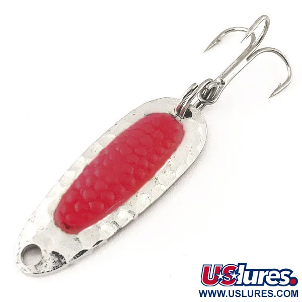 En klar röd simulerad romkorninsats står i centrum på detta 3,5 cm (1 1/2") skeddrag och ger en visuell trigger mot den hamrade nickelfinishen. Denna Nebco Pixee, identifierad med produktkod 12188, väger 4,5 g (3/16 oz) och har en kropp i kraftig mässing designad för stabilitet i starka strömmar eller vid långdistanskastning. Ursprungligen från National Expert Bait Company – föregångaren till det moderna varumärket Blue Fox – är detta bete ett klassiskt val för lax och steelhead. Den hamrade strukturen fångar ljus från alla vinklar, medan den röda insatsen visar ett tydligt sken vid svagt ljus, vilket efterliknar utseendet på riktig fiskrom. Hårdvaran inkluderar en robust trekrok fäst med en stark fjäderring. Presenterat i 5/5-skick, visar exemplaret en briljant finish och är helt utan slitage.
