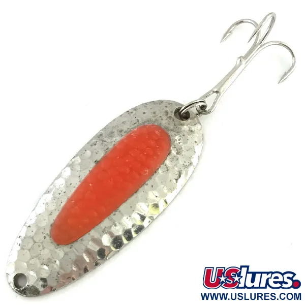 Den hamrade nickelfinishen på dessa klassiska skeddrag ger en strukturerad yta utformad för att fånga och sprida ljus i flera riktningar under vatten. Denna Nebco Pixee UV, med produktkod 9460, väger 3/4 oz (24 g) och mäter 2 1/2 tum (6,5 cm) i längd. Den utmärkande egenskapen för denna modell är den simulerade laxäggsinsatsen; även om den ser ut att ha en levande rosa eller laxfärgad ton i dagsljus, är den utformad för hög synlighet på djupt vatten. Detta exemplar har kvar en ren, blank finish på sin tunga mässingskropp och visar inga tecken på slitage på den ursprungliga trekroken, vilket ger ett skickbetyg på 5/5. Betets densitet möjliggör långa kast i kustvindar eller att nå botten av djupa höljor i älvar där steelhead och lax samlas. Konstruktionen är inriktad på hållbarhet, med en solid metallram och en säkert placerad plastinsats som har förblivit intakt under åren.