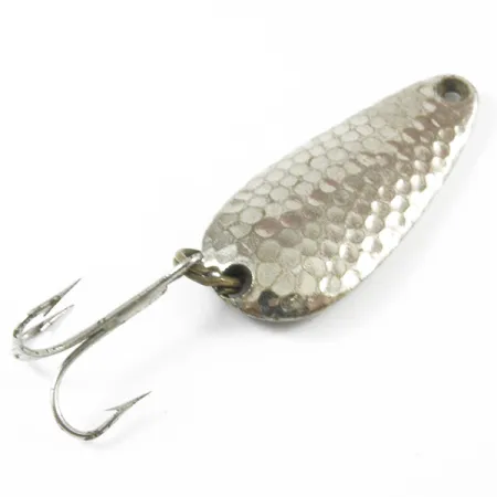 Detta 4 cm (1 1/2") långa skeddrag har en djupt hamrad nickelyta som är utformad för att maximera ljusreflektionen. Baksidan är slät och bär den tydliga stämpeln 'NEBCO TOR-P-DO 1 MPLS. MINN.', ett bevis på dess arv från fiskescenen i Minneapolis. Detta exemplar, med produktkod 3277, väger 7 g (1/4 oz) och är ett utmärkt val för spinnfiske efter öring eller abborre. Hårdvaran består av en klassisk trekrok fäst med en fjäderring, båda i mycket gott skick. Skeddraget är i kondition 4/5 och nickelpläteringen har kvar sin höga glans på båda sidor med endast lätta spår av tidens tand. Linfästet är rent borrat i den avsmalnande änden, redo för direkt knut eller ett litet beteslås.