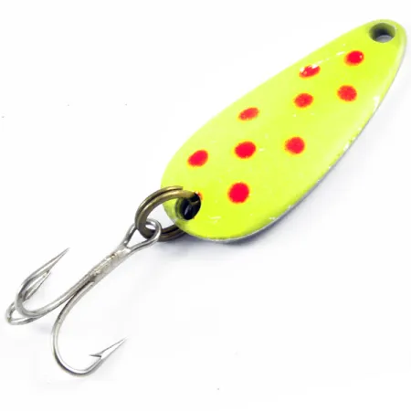 Målad med en lysande gul bas och tydliga röda prickar, erbjuder framsidan på denna Nebco Tor-P-Do 1 hög synlighet för olika vattenförhållanden. Detta specifika exemplar, katalogiserat under produktkod 3291, har en ren förnickling på baksidan där märkes- och modellnamnet är tydligt stämplade i metallen. Med en vikt på 1/4oz (7g) och en längd på 1 1/2" (4cm) är detta USA-tillverkade skeddrag balanserat för precision i kasten och djupkontroll. Komponenterna är solida och består av en stark fjäderring och en vass trekrok som inte visar några tecken på användning. Detta föremål är i utmärkt skick med ett betyg på 5/5. Den enkla, effektiva designen speglar den amerikanska filosofin från mitten av seklet för hållbara och funktionella fiskeredskap.