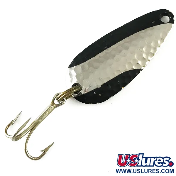 Hamrade nickelstrukturer i kombination med djärva svarta accenter definierar den slående visuella profilen hos detta vintage skeddrag. Med en storlek på 1 1/2" (4 cm) och en vikt på 1/4 oz (7 g) bär exemplaret den tydliga "NEBCO" TOR-P-DO-1-präglingen tillsammans med sitt ursprung i Ripley, Miss. på den polerade baksidan. Framsidan har en hamrad finish designad för att fånga och reflektera ljus, inramad av djupsvart färg på spetsarna. Identifierat med produktkod 6235, är draget utrustat med en klassisk trekrok säkrad av en robust fjäderring. Tillverkningen i massiv metall är typisk för amerikansk produktion från mitten av århundradet i USA. Skicket är utmärkt med en välbevarad finish och skarpa präglingar, vilket ger betyget 5/5. Linöglan är ren och precisionsborrad i den smala änden av den droppformade kroppen.