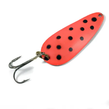 På den förnicklade baksidan finns "NEBCO TOR-P-DO 4" tydligt instämplat, vilket markerar detta som ett klassiskt amerikanskt skeddrag från Holdingford, Minnesota. Med en vikt på 45 g (1 2/3 oz) är draget byggt för att nå stora djup eller bryta igenom vinden vid långa kast. Framsidan har en klar röd finish med svarta prickar, ett val med hög synlighet för grumligt vatten. Skeddraget är 7,5 cm långt och dess robusta utförande speglar den funktionella designen hos äldre Nebco-redskap. Detta exemplar, registrerat under kod 2083, är i skicket 4/5 med endast smärre tecken på ålder. Hårdvaran är funktionell med en kraftig trekrok fäst i en solid fjäderring vid det droppformade dragets bas.