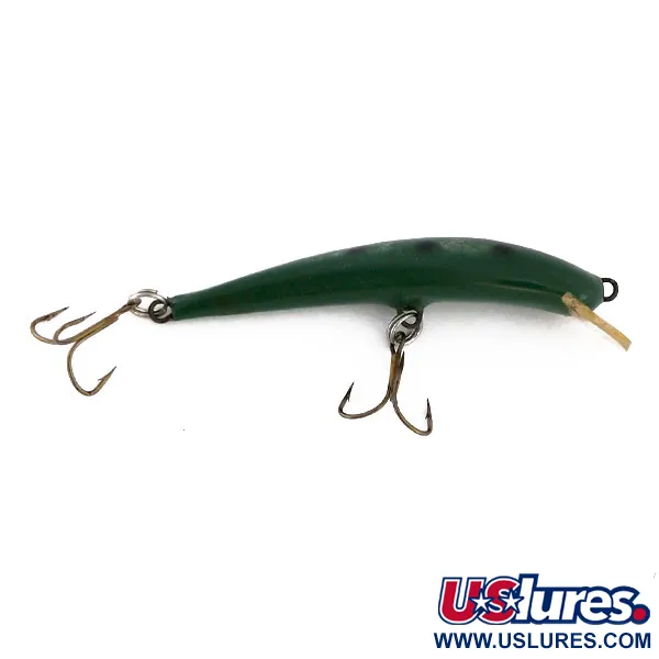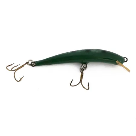 Handtäljd i trä med en karakteristisk platt ryggprofil representerar den 8 g (1/4 oz) tunga kroppen på denna Nils Master Invincible Floating höjdpunkten av finsk betesdesign. En rik grön finish med mörka markeringar täcker den 8 cm (3 1/4") långa kroppen, katalogiserad under produktkod 10218. Detta tysta, rassel-fria bete är konstruerat för mångsidighet och presterar effektivt oavsett om man kastar efter öring eller trollar efter större rovfiskar som lax och gädda. Den genomskinliga plastskeden, försedd med tillverkarens stämpel, är säkert monterad för att styra betet till ett djup på 2 m (6,5 ft). Med tanke på dess 5/5 betyg är utsidan exceptionellt ren, vilket visar upp den högkvalitativa lacken och noggrann bevarande. Dubbla trekrokar är fästa via robusta fjäderringar, redo för vattnet. Den bredsidiga geometrin är ett funktionellt kännetecken för denna specifika modell, avsedd att ge en tydlig silhuett sedd underifrån.