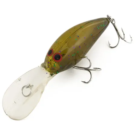 Lila och gröna glitterflingor ligger inbäddade i den transparenta olivfärgade kroppen på denna djupgående crankbait. Denna Norman DD 14 har produktkod 7478, mäter 7 cm och väger 16 g. Konstruktionen inkluderar en intern rasselkammare för en ljudlig närvaro i vattnet och en svävande (suspending) gång för varierande fisketekniker. Den stora, genomskinliga hakskeden är utformad för att nå djup på 3,6 m – 4,2 m, lämplig för både spinnfiske och trolling. På huvudet ger de skarpa röda ögonen en tydlig kontrastpunkt mot den olivfärgade finishen. Komponenterna är i utmärkt skick, rankat 5/5, med original fjäderringar och trekrokar. Detta USA-tillverkade exemplar uppvisar den klassiska Norman-profilen med sin karaktäristiska glitterfyllda plast.