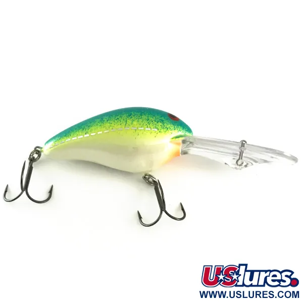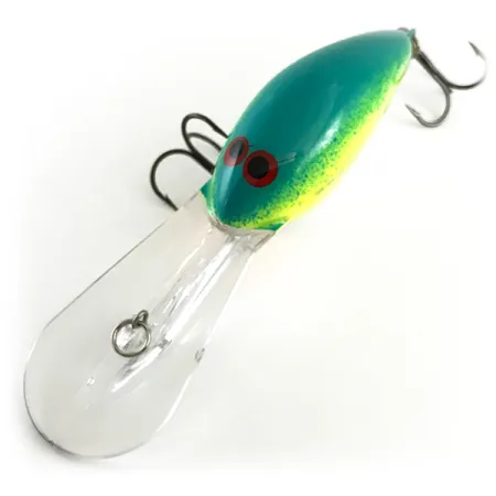 En livlig blandning av ljusblått, gult och vitt definierar profilen för denna 28 g (1 oz) djupgående crankbait från USA. Identifierad med produktkod 6665, är denna Norman DD 22 designad för att nå djup på 4,5 till 5,5 m (15 till 18 fot) tack vare sin överdimensionerade genomskinliga haksked. Den visuella attraktionen förstärks av stora ögon med röd mitt och en specialiserad lackering som avslöjar ett självlysande sken vid svagt ljus, vilket gör den mycket synlig i mörkt eller grumligt vatten. Den 8 cm (3 1/4") långa kroppen rymmer en intern rasselkammare designad för en kraftig akustisk närvaro vid kast eller trolling. Detta exemplar är i 5/5-skick och framstår som helt oanvänt. Utrustningen inkluderar två trekrokar med mörk finish monterade på buken och stjärten via extra starka fjäderringar.