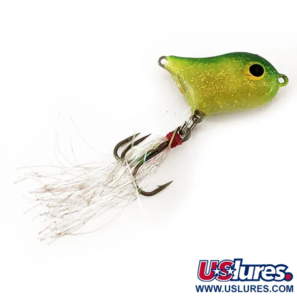 Klädd med silver-flash och en röd trådlindning vid trekroken, visar detta exemplar den klassiska användbarheten hos Norman "Front Runner"-designen. Kroppen på 2,2g (1/16oz) har en levande gul och grön gradient, kraftigt accentuerad med fint guldglitter som effektivt fångar ljuset. Med en längd på endast 3cm (1 1/4") konstruerades den som en yt-teaser för att riggas in-line framför ett större walking bait eller en popper. De överdimensionerade svarta ögonen med gula kanter är klara och centrerade, vilket ger en tydlig huggpunkt. Denna USA-tillverkade lockbete med produktkod 11599 är i utmärkt 5/5-skick. Krokarna är blanka och färgen behåller den ursprungliga lystern hos den chartreusefärgade buken och den mörkgröna ryggen.