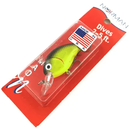 Detta grundgående crankbait dyker mellan 0,6 och 1,5 m (2-5 fot) och har det klassiska högvisuella färgschemat Chart / Svart / Orange, specifikt angivet som färgkod MAD-21. Detta exemplar, med produktkod 11352, är ett bete på 11 g (2/5 oz) som mäter exakt 5 cm (2") i längd. Med betyget 6 är det oanvänt och bevarat i sin ursprungliga röd-vita vintageförpackning. Den klara skeden är integrerad i en kompakt kropp designad för både spinnfiske och trolling. På baksidan av förpackningen kan man fortfarande se den detaljerade guiden 'Tuning a Crankbait' och en vikt/längd-tabell typisk för Normans produktion i Greenwood, Arkansas. Konstruktionen inkluderar det ikoniska 'Made in U.S.A.'-flaggmärket framträdande på plastbubblan. Lackeringen kännetecknas av en ljus neon-chartreuse bas med en solid svart rand längs ryggen och ett tydligt orange parti nära buken och halsen.