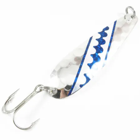 Detta kanadensisktillverkade skeddrag väger 1/2 oz (14 g) och har en äkta silverpläterad finish designad specifikt för ljusreflektion på större djup. Len Thompson Northern King 28 UV, katalogiserad som produktkod 3530, är ett trollingdrag i mässing som mäter 3 3/4" (9,5 cm). Northern King-serien introducerades ursprungligen 1984 och använder silverplätering för att säkerställa att metallen förblir synlig när den sjunker. Detta specifika exemplar har en hamrad textur på framsidan, dekorerad med ett blått och vitt tejpmönster som ger UV-reaktivitet för synlighet i djupare vattenlager. På baksidan finns en ren, bikakemönstrad silverfinish. Monteringen består av en robust trekrok fäst via en fjäderring, helt i linje med dess dedikerade trollingdesign. I 5/5-skick förblir silverpläteringen ljus och UV-accenterna är välbevarade längs hela kroppen.