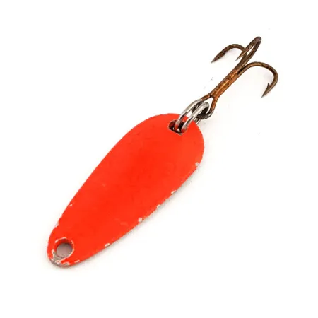 Detta vintage skeddrag mäter exakt 3 cm (1 1/4") i längd och har en tydlig droppformad profil designad för lätt fiske. Draget har en högvisuell orange finish på framsidan som, precis som namnet Otto's Ace UV antyder, lyser intensivt vid exponering för ultraviolett ljus. Med en vikt på 3g (3/32oz) identifieras betet med produktkod 12763 och tillverkades i USA. En silverfärgad baksida kompletterar den ljusorangea framsidan, medan hårdvaran består av en enkel fjäderring och en trekrok. Bedömd till skicket 5/5, uppvisar draget lätt slitage på färgkanterna och en mörkare ton på krokens metallyta.