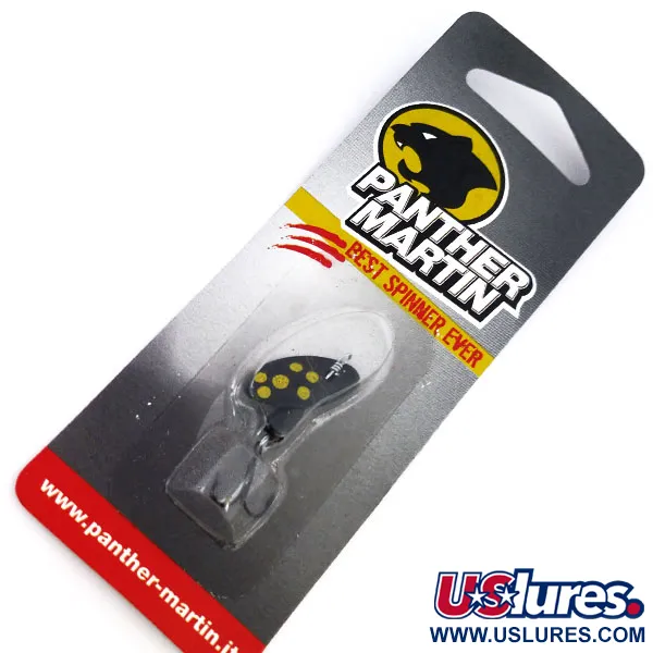Svarta skedar dekorerade med fem distinkta gula prickar definierar det klassiska utseendet hos denna italiensktillverkade Panther Martin 2-spinnare. Med en vikt på 3/32oz (2,5g) och en total längd på 1 3/4" (4,5cm), använder betet varumärkets unika genomgående axelkonstruktion där skeden roterar direkt på tråden utan bygelfäste. Detta exemplar, med produktkod 10242 och modell TMBFL GR 2, är i oanvänt skick i sin ursprungliga blisterförpackning. Den droppformade kroppen har en finish i metallsilver, vilket ger en solid kontrast till skedens Svart / Gula (BKY) färgschema. Dessa beten utvecklades ursprungligen i Europa och kännetecknas av sin enkla mekanik, särskilt den axelmonterade skeddesignen som uppmuntrar till omedelbar rotation vid hemfiskning. Förpackningen visar den karakteristiska svarta panterlogotypen och varumärket "Best Spinner Ever" som hjälpte till att befästa dess status bland både samlare och sportfiskare.