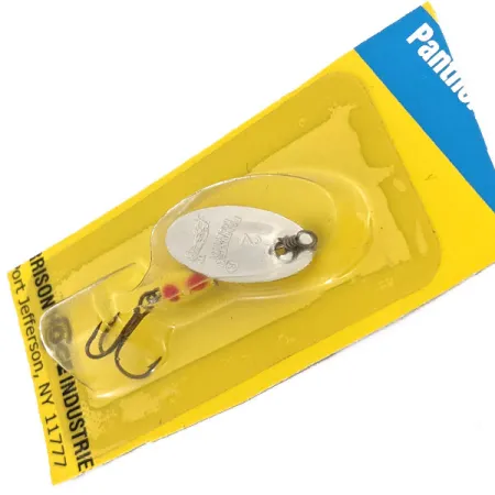 Denna kompakta spinnare på 2,5 g (3/32 oz) mäter 4,5 cm (1 3/4") och är ett klassiskt exempel på de finesse-redskap som tillverkats för Harrison-Hoge Industries. Det silverfärgade bladet är stämplat med storlek och varumärke, och har den karaktäristiska designen där bladet är trätt direkt på trådaxeln utan länk. Denna konstruktion vilar på en viktad droppformad kropp i gult med tre distinkta röda prickar. Denna Panther Martin 2, märkt med kod 13062, är oanvänd och ligger kvar i sin ursprungliga gul-blå blisterförpackning. Baksidan visar en monokrom vintagebild av en sportfiskare med en gädda, tillsammans med varningstexter och kontaktinformation. Draget är utrustat med en mörkfinishad trekrok fäst vid basen av den målade kroppen.