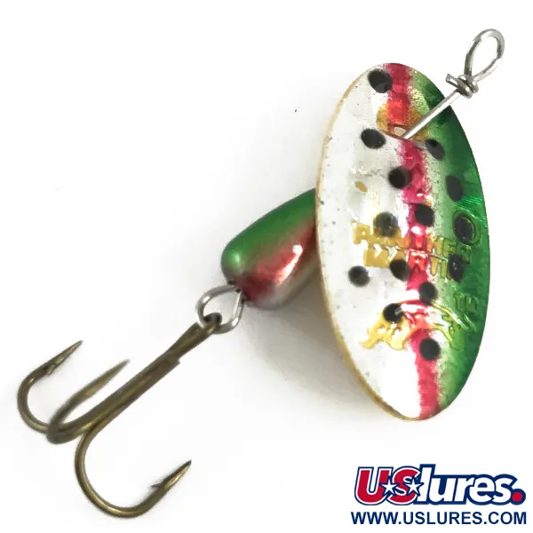Polerat guld på skedens baksida skapar ett högintensivt blänk som kompletterar det detaljerade Regnbåge-mönstret på framsidan. Med en längd på 3,5 cm använder denna spinnare den ikoniska genom-skeden-konstruktionen som Panther Martin banade väg för för hög rotationsprestanda. Den viktade droppformade kroppen på 2,5 g är målad med en mjuk övergång i metalliskt grönt och rött. Just detta exemplar, produktkod 4375, kommer från märkets italiensktillverkade era och är i oanvänt skick. Skedens framsida har en vit bas med gröna kanter, en röd vertikal rand och tydliga svarta prickar för att efterlikna naturlig föda. En standard trekrok i bronsfinish är fäst via en robust trådögla vid den viktade kroppens bas.