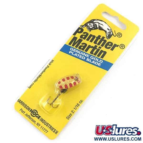 Röda diagonala ränder över en äkta guldpläterad sked karaktäriserar denna klassiska spinnare på 1,77 g (1/16 oz). Denna storlek 2-modell med produktkod 4540 använder den klassiska konvex/konkava skeddesignen som sitter direkt på betesaxeln, vilket är ett signum för Panther Martin-serien. Längden på 5 cm (2") kompletteras av en viktad kropp avsedd för kaststabilitet i små strömmar eller öppet vatten. Tillverkad i Dominikanska republiken för Harrison-Hoge Industries, är detta specifika bete i oanvänt skick, perfekt bevarat i sin originalförpackning. Den droppformade kroppen och den direktmonterade skeden är konstruerade för att börja rotera omedelbart vid kontakt med vattnet. Den är utrustad med de vassa trekrokar som är standard för dessa lättviktsfavoriter, redo för öring- eller abborrfiske.