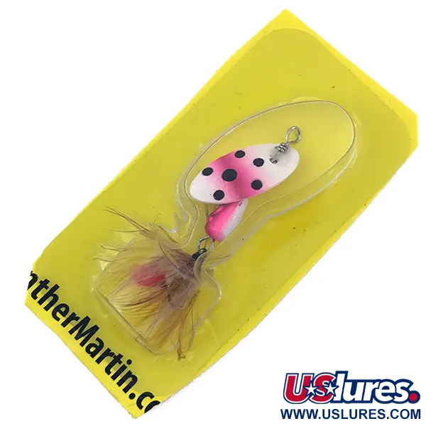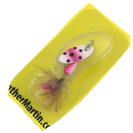 Denna spinnare väger 3/32oz (2,5g) och har ett slående öringmönster med en vit bas, lysande rosa kanter och tydliga svarta prickar. Skeden är monterad direkt på axeln, en signaturdesign för Panther Martin som utesluter den traditionella bygeln för att möjliggöra en snabbare rotationshastighet. Betet är 2" (5cm) långt och utrustat med en trekrok klädd i gula och ljusbruna fjädrar. Detta exemplar, med produktkod 4992, ligger kvar i sin gula originalblister och är i oanvänt skick. Den droppformade kroppen är viktad för kastprecision, och förpackningen anger ursprunget Dominikanska republiken för Harrison-Hoge Industries. Baksidan av kortet visar tillverkarens historiska adress i Port Jefferson, NY, samt tekniska varningar.