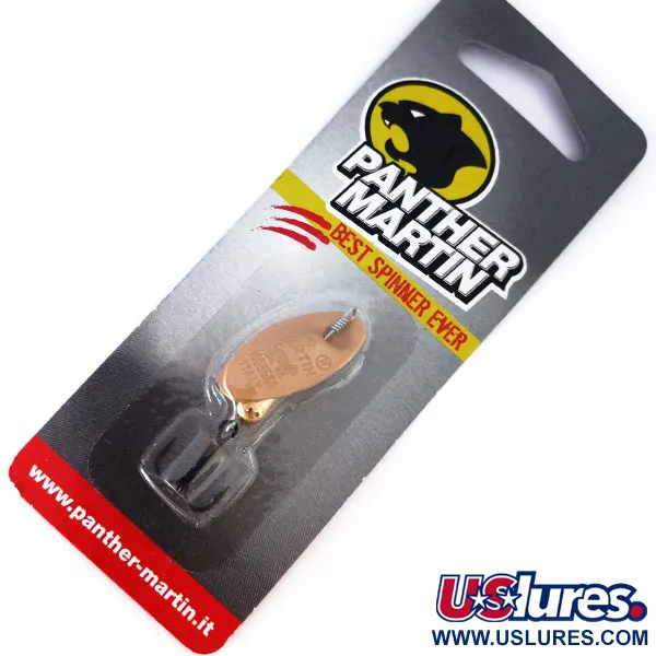 Denna vintage italiensktillverkade spinnare väger exakt 4 g (1/8 oz) och har en guldfärgad finish med det karakteristiska droppformade bladet präglat med ursprunget ”Panther Martin Italy”. Bladet är unikt monterat direkt på axeln utan en separat skackla, ett designval som utmärker dessa spinnare genom att låta det 5 cm (2") långa betet börja rotera nästan omedelbart vid rörelse. Detta specifika exemplar, katalogiserat under produktkod 10325, kombinerar sitt metallblad med en mörk, viktad kropp för effektiva kast i strömmande vatten. Konstruktionen är förankrad med en robust trekrok vid basen, i exakt samma skick som när den lämnade fabriken. Betet levereras i sin originalförpackning prydd med den ikoniska svarta panterlogotypen och är oanvänt, vilket ger ett skickbetyg på 6. Den direktmonterade bladdesignen förblir varumärkets signum och skapar en specifik vibrationsprofil som har gjort Panther Martin till en stapelvara i fiskelådor sedan 1950-talet.