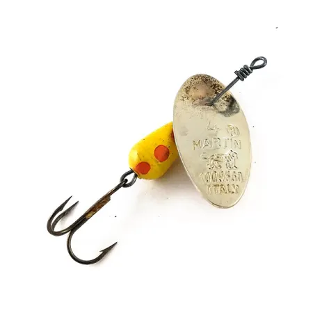 "Italy" är tydligt stämplat på den konkava sidan av det silvriga skedbladet, vilket identifierar denna Panther Martin 4 som ett exemplar från den ursprungliga europeiska tillverkningslinjen. Betet väger 4g (1/8 oz) med en total längd på 4cm (1 1/2") och har en gul droppformad kropp prydd med tydliga röda prickar. Skedbladet, numrerat 1009368, har det ikoniska namnet L MARTIN och lejonstämpeln, nyckeldetaljer för att verifiera autentisk italiensk vintageproduktion. Skicket är graderat till 5/5, finishen är fortfarande blank och hårdvaran saknar det slitage som ofta finns på använda spinnare. Denna specifika modell, med produktkod 13282, använder den klassiska konstruktionen där det silvriga bladet sitter direkt på axeln. En trådlindad trekrok fullbordar bygget, säkrad med de täta och jämna lindningar som är karaktäristiska för detta märkes montering.