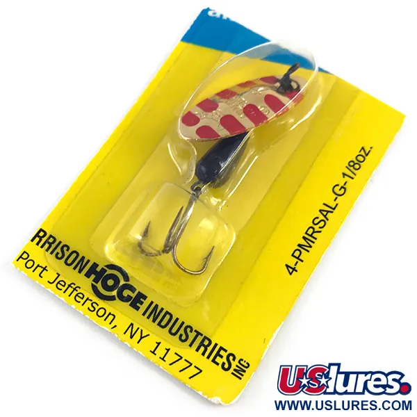 Denna klassiska spinnare på 4 g har ett guldfärgat skedblad dekorerat med distinkta röda prickar. Draget är byggt med den karaktäristiska konstruktionen där bladet roterar direkt på axeln. Detta exemplar med produktkod 4372 ligger i sin ursprungliga blisterförpackning från Harrison Hoge Industries, märkt med adressen i Port Jefferson, NY. Eftersom det är oanvänt är den mörka finishen på den droppformade kroppen och trekroken i mycket gott skick. Förpackningen har den traditionella gula och blå designen, inklusive ett vintage-erbjudande på baksidan tillsammans med ett svartvitt fiskefoto. Denna specifika modell, märkt 4-PMRSAL-G, visar den 4,5 cm långa konstruktionen som gjorde Panther Martin till en favorit bland öring- och abborrfiskare. Förpackningen refererar även till tillverkarens webbplats och adressen på Columbia St., vilket markerar en specifik era i varumärkets historia.