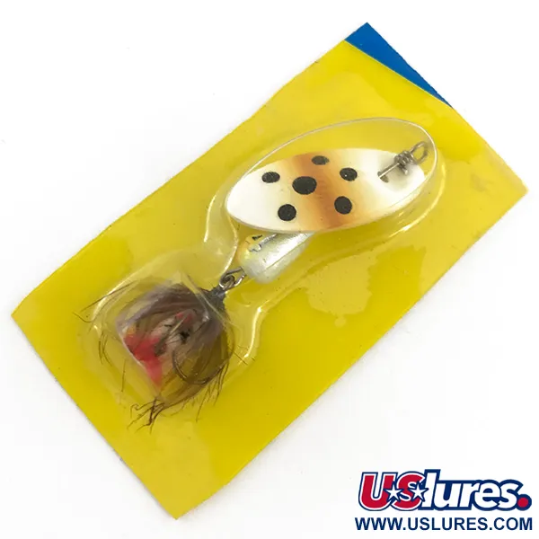 En viktad droppformad kropp gör att denna 4 g (1/8 oz) spinnare kastar som en kula och når de svåråtkomliga fickorna i strömmande vatten. Med en total längd på 4,5 cm (1 3/4") har betet den signifikanta Panther Martin-designen där skeden är monterad direkt på axeln för att underlätta en snabb rotation. I denna Trout-färgvariant, identifierad med produktkod 4412, har den konkava skeden en gräddvit bas, mörka fläckar och en mjuk brun gradient. Kroppen matchas i en ren gräddton som leder bak till en fjädrad stjärt. Denna hackle består av mörkbruna fibrer med en liten röd accent för att efterlikna gälar eller ett sår. Distribuerad av Harrison Hoge Industries och tillverkad i Italien, levereras detta exemplar i sin ursprungliga gula blisterförpackning. Baksidan av kortet innehåller säkerhetsvarningar och tekniska detaljer, och noterar den pläterade skedens förmåga att reflektera ljus på långt håll. Detta oanvända exemplar behåller sin ursprungliga fabriksglans och har ett skickbetyg på 6.