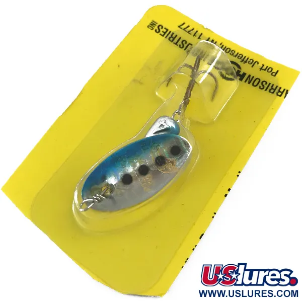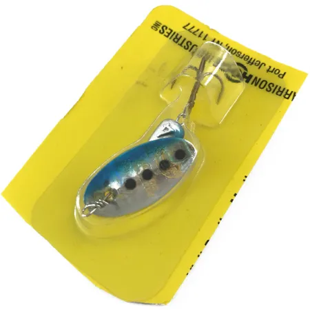 Med en storlek på 4 cm är den kompakta profilen hos Panther Martin 4 uppbyggd kring varumärkets signaturformade droppkropp. Denna spinnare på 4 g, med produktkod 5171, har ett skedblad i silver/blått prytt med fyra distinkta svarta prickar. Ett kännetecken för Panther Martin-designen är att bladet är monterat direkt på axeln, vilket möjliggör omedelbar rotation vid kontakt med vatten. Den viktade kroppen ger den densitet som krävs för precisa kast i tät vegetation eller strömdrag. Detta exemplar är oanvänt i sin gula originalförpackning från Harrison Hoge Industries. Tillverkad i Dominikanska republiken med en vass trekrok fäst vid den viktade kärnan, vilket gör den till ett pålitligt verktyg för öringfiske i rinnande vatten.