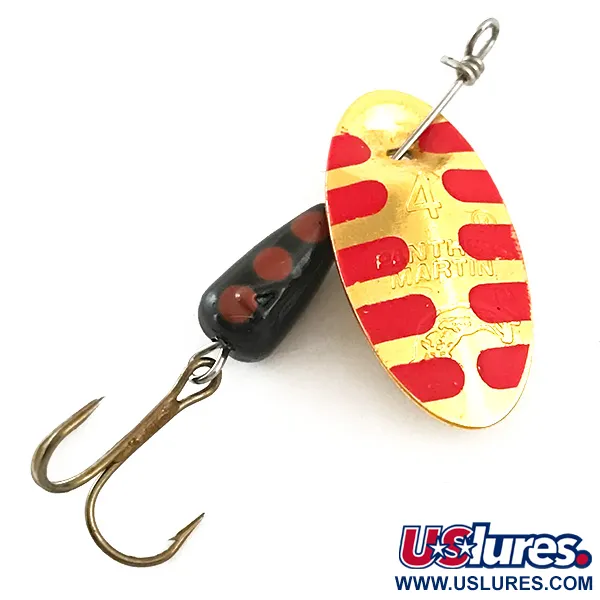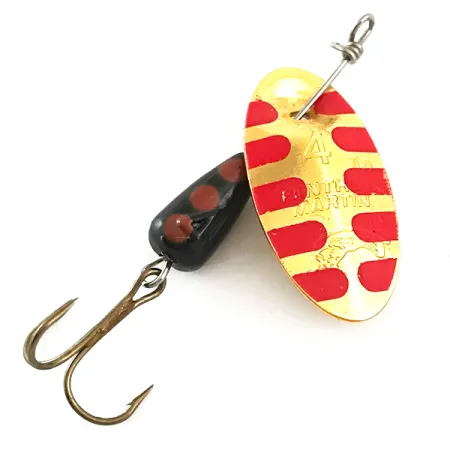 Ett guldglänsande blad med tydliga röda ränder kännetecknar denna spinnare i storlek 4, som väger balanserade 1/8oz (4g). Den konkava sidan av bladet är stämplad med Panther Martin-namnet och siffran 4, vilket framhäver dess italienska ursprung. Detta exemplar har den karaktäristiska in-line-designen där axeln går direkt genom bladet, vilket möjliggör snabb rotation. Bakom en liten guldpärla sitter en svart droppformad kropp dekorerad med högkontrasterande röda prickar. Med en totallängd på 1 1/2" (4cm) är betet utrustat med en robust bronserad trekrok. Skicket är 5/5, vilket innebär att det är oanvänt och har livfull, välbevarad färg på alla ytor. Produktkod 6335 är kopplad till denna specifika färgkombination, avsedd för hög synlighet under olika vattenförhållanden.