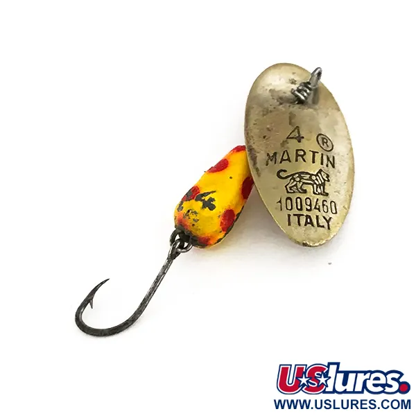 Det ikoniska lejonlogotypen och patentnumret 1009460 är tydligt stämplade på det matta mässingsbladet, vilket intygar dess autentiska italienska ursprung. Med en vikt på 1/8 oz (4 g) är denna spinnare ett precisionsverktyg för öringfiske i mindre vatten. Den droppformade kroppen har en klar gul finish med tydliga röda prickar, en färgkombination som bevisat sitt värde i otaliga vattendrag under decennier. Eftersom bladet är monterat direkt på axeln utan bygel börjar det rotera omedelbart vid invevning. Denna Panther Martin 4, med produktkod 7512, har en kompakt längd på 4 cm (1 1/2") och representerar den era av produktion som samlare värdesätter för dess hantverksskicklighet. Den är utrustad med en enkelkrok med mothugg, vilket ger en mer traditionell profil som minskar risken för bottennapp i steniga bäckar. Betet behåller sin ursprungliga charm trots mindre ytslitage från tidigare användning, och skicket bedöms till respektabla 4/5.