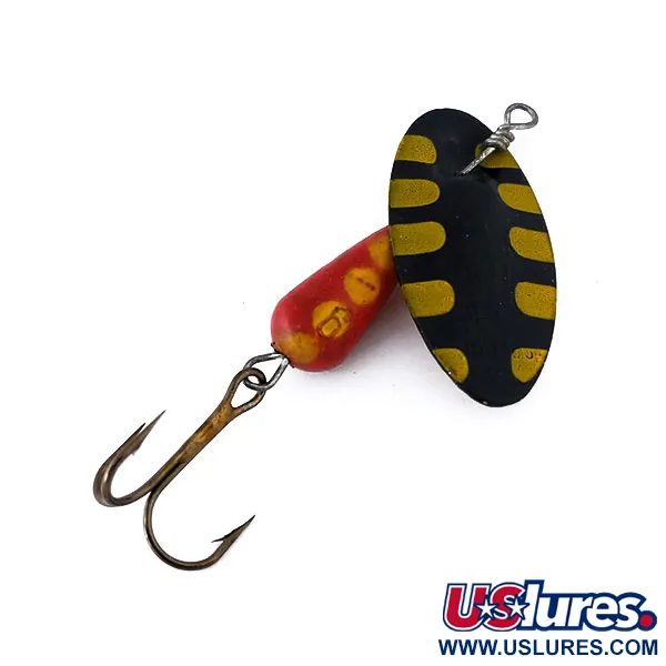 Gula horisontella ränder pryder den mattsvarta konvexa ytan på detta spinnarblad i storlek 6. Med en vikt på 6 g (3/16 oz) och en längd på 5,5 cm har detta italiensk-tillverkade exemplar den ikoniska konstruktionen med axeln genom bladet som utmärker märket bland inline-spinnare. Den droppformade kroppen är lackerad i klar rött med gula prickar och är i anmärkningsvärt gott skick för sin ålder med betyget 5/5. På baksidan av bladet finns en polerad guldyta, kompletterad med en liten distanspärla i mässing placerad precis ovanför den tyngda kroppen. Den bronserade trekroken är fäst med en säker trådögla och är i utmärkt skick. Detta bete, registrerat under produktkod 10844, exemplifierar den klassiska estetik som återfinns i europeisk fiskematerielexport från mitten av seklet.