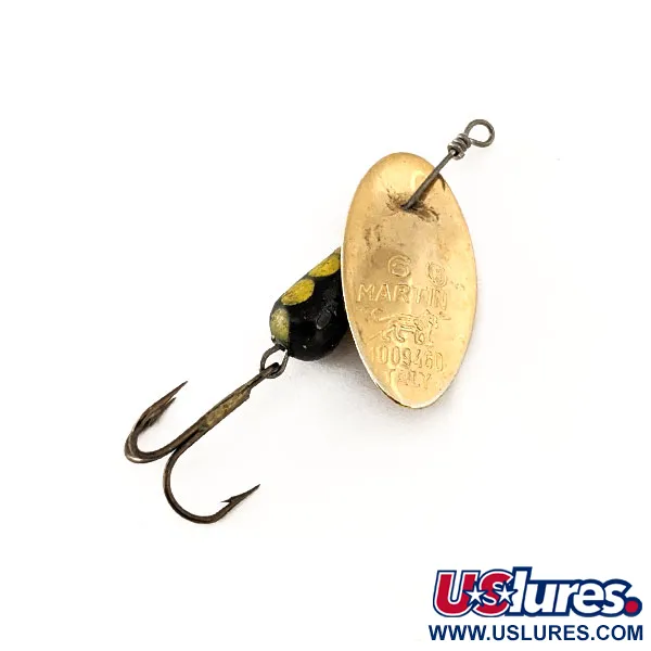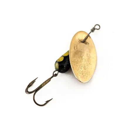 Den klassiska Panther Martin-logotypen och ursprungsmärkningen Italy är tydligt stämplade på det konvexa guldbladet, vilket utmärker denna tidiga produktionsmodell. Detta exemplar, med produktkod 11117, uppvisar den klassiska svarta droppformade kroppen dekorerad med livfulla gula prickar för hög kontrast under vattnet. Betet är 5,5 cm (2 1/4") långt och väger 6 g (3/16 oz) och använder en in-line-konstruktion där skeden monteras direkt på axeln. Detta specifika designval, som märket var först med, skapar en unik rotationsprofil jämfört med traditionella spinnare med bygel. Hårdvaran består av en bronserad trekrok och en tätt lindad trådögla, båda i exceptionellt skick. Med ett tillståndsbetyg på 5/5 är guldfinishen på bladet och färgen på den viktade kroppen anmärkningsvärt välbevarade och fria från slitage.