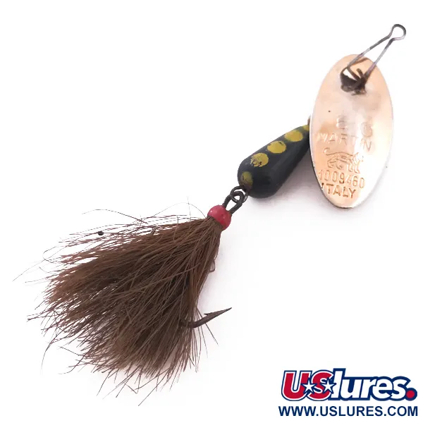 Tydligt stämplat på den konvexa skeden finns märket "ITALY", ett bevis på det europeiska arvet hos denna Panther Martin 6. Detta specifika exemplar, med produktkod 4024, har den klassiska droppformade kroppen i djupsvart med distinkta gula prickar. Komponenterna är exceptionellt välbevarade, och den kopparfärgade skeden visar en varm lyster tillsammans med gravyrerna "MOD. DEPOSE" och patentnummer 1009460. På baksidan sitter en brun fjäderklädd trekrok, accentuerad av en enstaka röd pärla som ger en subtil fokalpunkt vid fästet. Med en vikt på 6 g (3/16 oz) och en längd på 5 cm (2"), framhäver designen det ikoniska inline-utförandet där skeden roterar direkt på trådaxeln istället för på en bygel. Skicket är ett perfekt 5/5, där färgen är intakt och bucktail-materialet ser rent och välskött ut. Ett litet beteslås sitter i den övre öglan, redo för lina. Skedens konkav-konvexa form är designad för att ligga tätt mot den viktade kroppen under invevning.