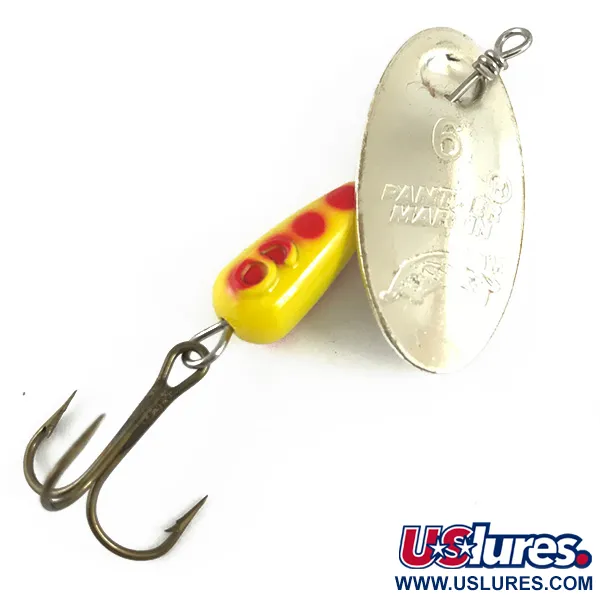 En livfull gul droppformad kropp prydd med tydliga röda prickar kännetecknar denna vintage Panther Martin 6. Detta specifika exemplar, identifierat med produktkod 4376, har det klassiska silverbladet stämplat med siffran "6" och det karakteristiska hoppande öringemblemet. Tillverkad i Italien, mäter draget 5 cm och väger välbalanserade 6 g. Samlare noterar att bladet är monterat direkt på axeln, ett signum för Panther Martin-designen som gör att det kan rotera utan en separat bygel. Den bronserade trekroken är ren och säkert fäst via trådöglan. Detta drag är oanvänt och visar inga tecken på vattenkontakt eller slitage. Den polerade silverfinishen på bladet skapar en skarp visuell kontrast mot den målade kroppen. Varje komponent, från mässingspärlan till de precisionsformade trådöglorna, speglar kvaliteten på italiensk tillverkning från denna era.