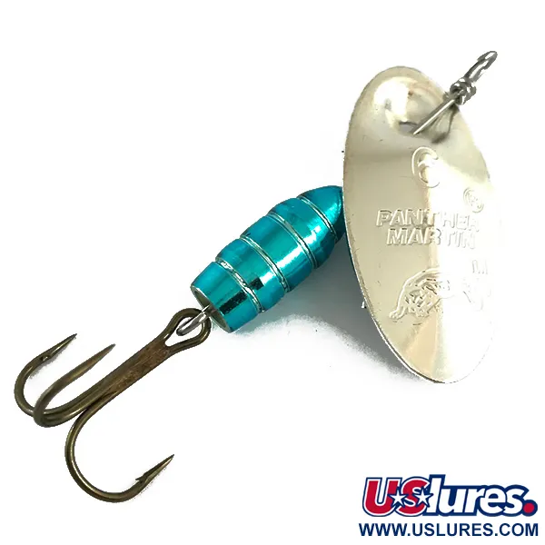 Turkosmetalliska segment bildar den viktade kroppen på denna vintage-spinnare och ger en levande färgklick mot den polerade silverskeden. Skeden i sig är unikt monterad direkt på axeln, ett signaturval i designen som Panther Martin var först med för att säkerställa en jämn rotation. Detta exemplar på 3/16 oz (6 g), som identifieras med produktkod 4409, uppvisar klassiskt italienskt hantverk med sin stämplade "PANTHER MARTIN"-text och det igenkännbara emblemet med den hoppande katten. Två små guldtonade pärlor fungerar som distanser mellan skeden och den cyanfärgade kroppen, som har en total längd på 2" (5 cm). Detta specifika bete är oanvänt och har kvar sin ursprungliga fabriksfinish och lyster för ett tillståndsbetyg på 6. En vass trekrok är fäst vid trådkonstruktionen, redo för vattnet eller samlarens vitrinskåp.