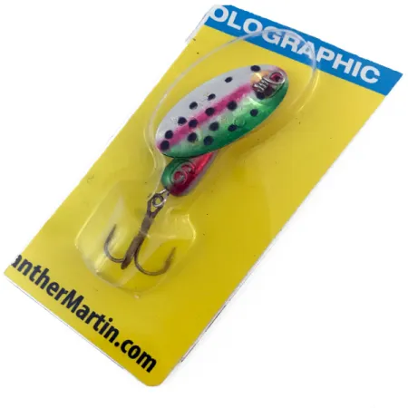 Regnbågsmönstret utmärker det holografiska skedbladet på denna Panther Martin 6, med en finish som övergår från en djupgrön rygg till en rosa sidolinje över en silvervit buk med tydliga svarta prickar. Spinnaren har produktkod 4999, väger 3/16 oz (6 g) och är 2 tum (5 cm) lång. Till skillnad från traditionella spinnare som använder en bygel (clevis), är bladet på denna modell monterat direkt på axeln, vilket gör att det roterar i en snäv radie nära den viktade droppformade kroppen. Själva kroppen har en metallic röd och grön färgsättning, designad för att matcha det öringinspirerade bladet. Tillverkad i Dominikanska republiken under Harrison Hoge Industries, levereras betet i sin gula original-blisterförpackning som visar företagets webbplats och en tydlig blå 'HOLOGRAPHIC'-rubrik. Detta exemplar är oanvänt och ser ut exakt som när det först förpackades för detaljhandeln. Baksidan av kortet ger tekniska detaljer om den konvex/konkava bladdesignen och den rakbladsvassa trekroken i brons. Varje detalj, från den viktade kroppen till den specifika färgövergången på bladet, framhäver den klassiska konstruktion som har gjort detta märke till en favorit för strömfiskare.
